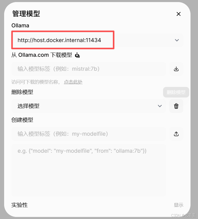 打开管理模型,添加Ollama 连接,填写配置信息: