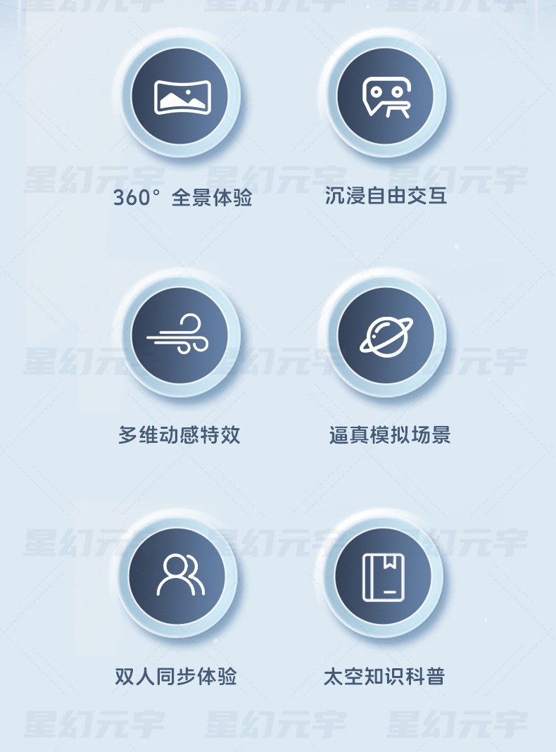 360°全景沉浸,体验感震撼:搭载360°沉浸式VR头显,1:1还原太空实景,呈现地球视角、星际景观、行星穿越等壮丽场景,配合环绕音效与多维动感特效(上下俯冲、左右摇摆、前倾后仰等),让体验者亲身感受火箭升空、失重飞行的完整过程,视觉与感官冲击强烈;