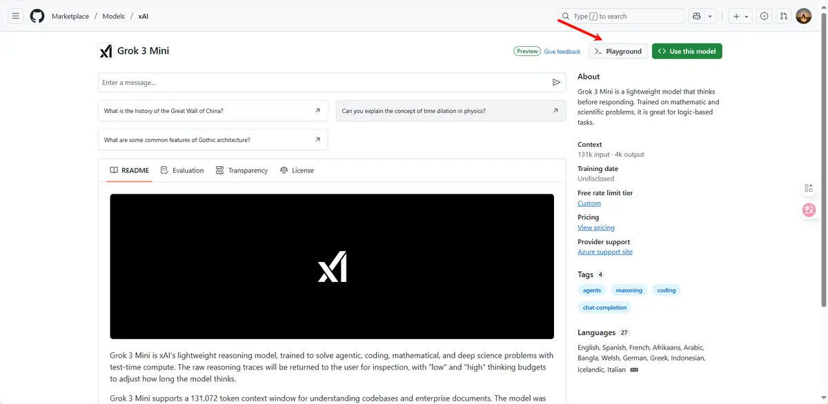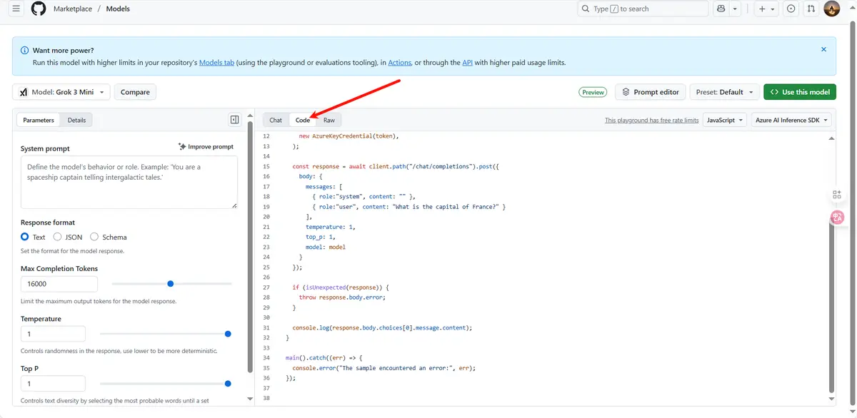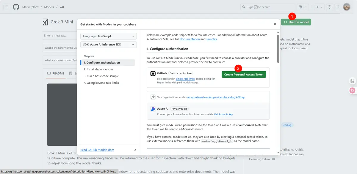 通过 Use This Model 访问去创建免费 Token Key,再放到调用代码里使用。