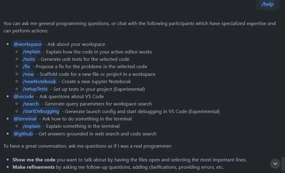 /explain:解释当前编辑器中代码的工作原理/tests:为选中的代码生成单元测试/fix:为选中代码中的问题提出修复方案/new:在工作区中创建新文件或项目的脚手架代码/newNotebook:创建一个新的 Jupyter Notebook/setupTests:在项目中设置测试(实验性功能)
