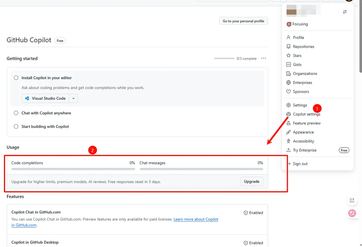 关于个人额度,可以在 Github 的 Copilot 菜单里查看
