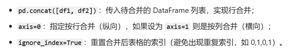 比较反直觉,行合并指的是把两个表格一上一下拼接在一起,axis=0;列合并指的是一左一右航向拼接,axis=1。