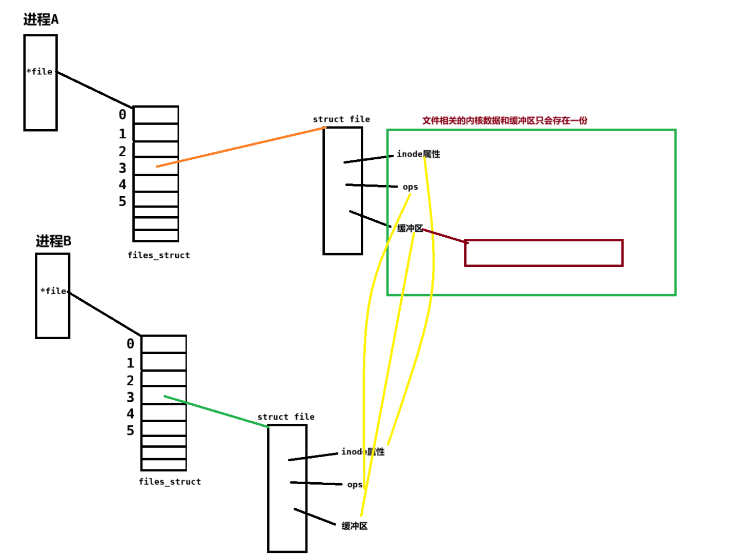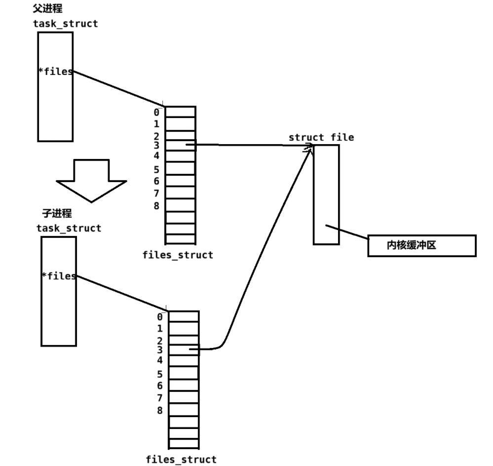 本质:子进程会拷贝父进程的pcb和files_struct,files_struct表中的内容也会拷贝(指向同一个struct file)相当于一个浅拷贝,如下图: