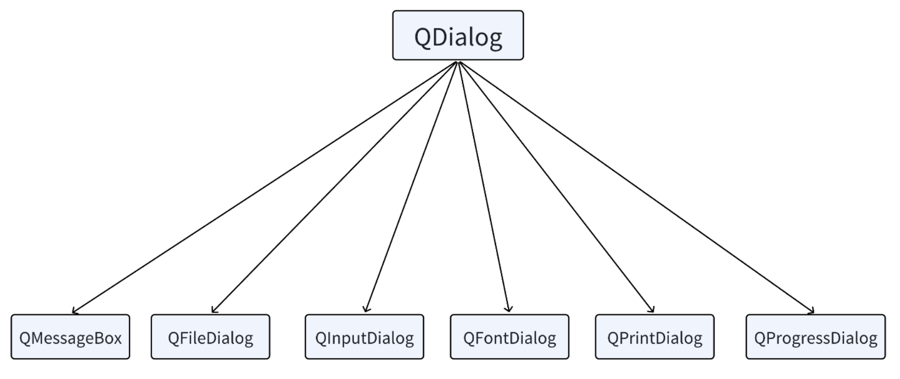 Qt提供了多种可复⽤的对话框类型,即 Qt 标准对话框。Qt 标准对话框全部继承于 QDialog类。常⽤标准对话框如下: