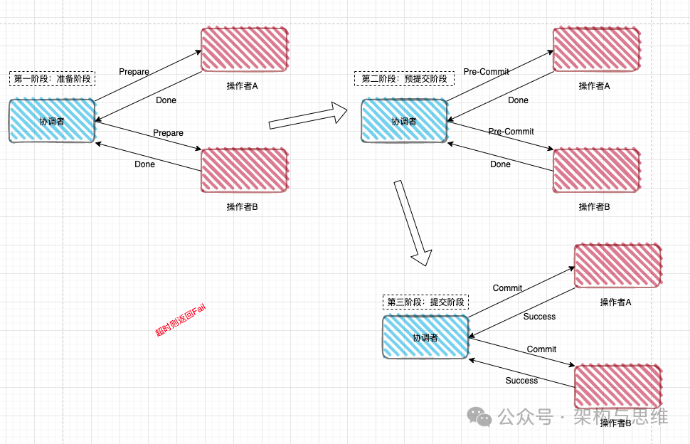 三阶段提交(3PC,Three-Phase Commit)是对二阶段提交(2PC)的改进版。它通过引入超时机制 和预提交阶段 ,主要解决了 2PC 的阻塞问题。