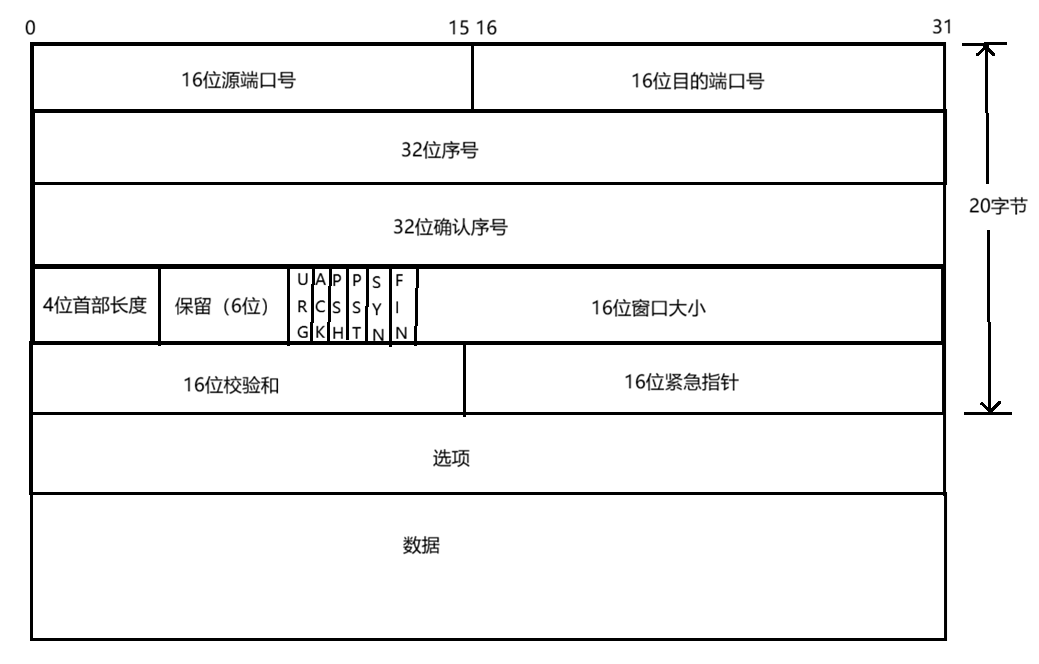 4位TCP报头长度(单位字节) :表示该TCP头部有多少个32位bit(有多少个4字节),所以TCP头部最大长度是15*4=60 字节。4位首部长度的大小为标准报头+选项的大小,范围为【20-60】字节。标准报头的大小为20字节,所以如果选项为0,那么4位首部长度的值为0101(十进制的5).