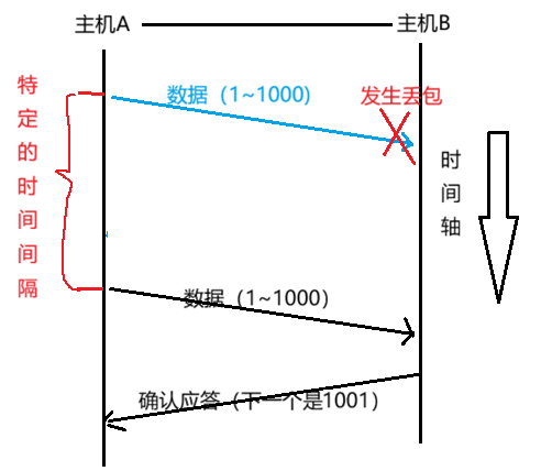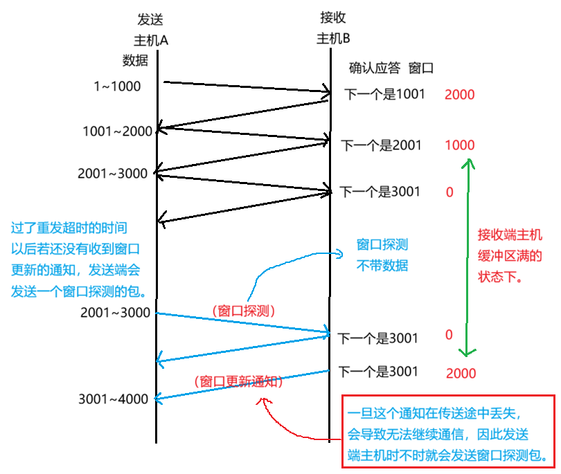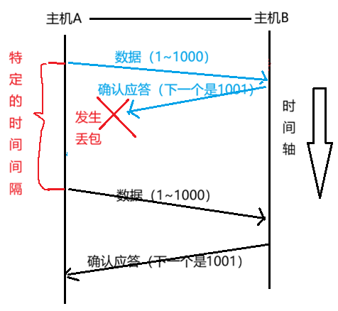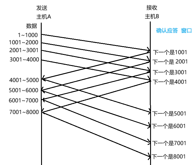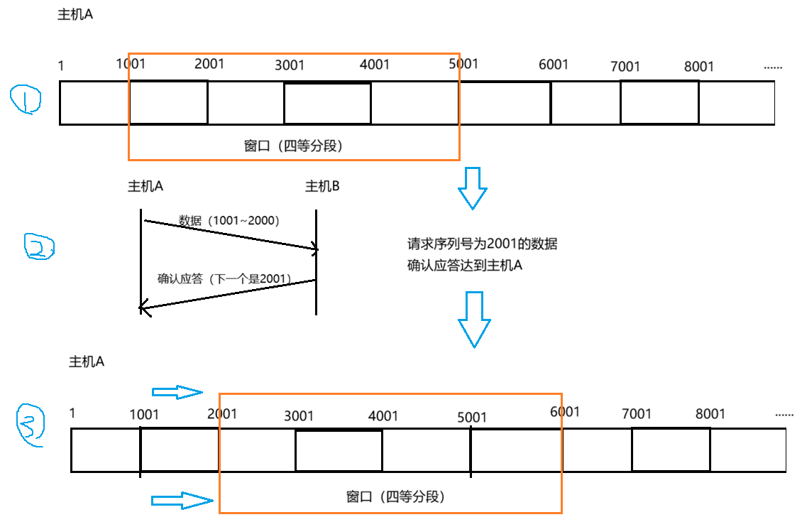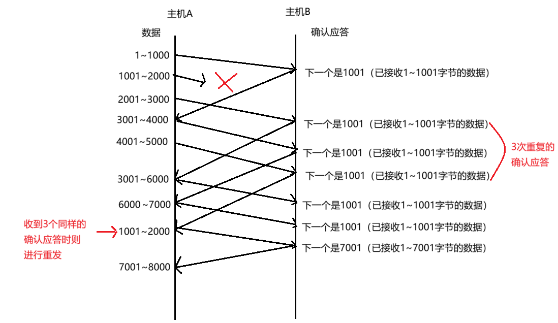 2.如果发送端主机连续三次收到了同样一个"1001"这样的应答,就会将对应的数据1001~2000重新发送。----(这种机制被称为"高速重发控制",也叫做"快重传")。