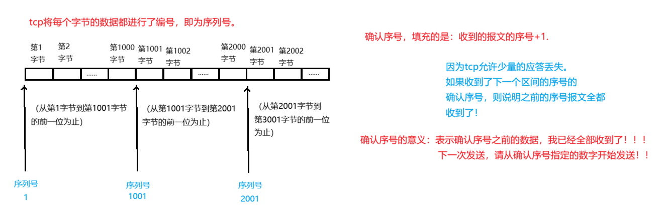32位序号:标识当前数据段第一个字节在整个数据流中的位置(例如:发送端:1-1000发给接收端)。
