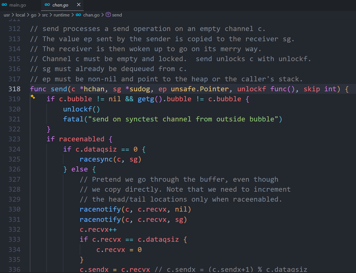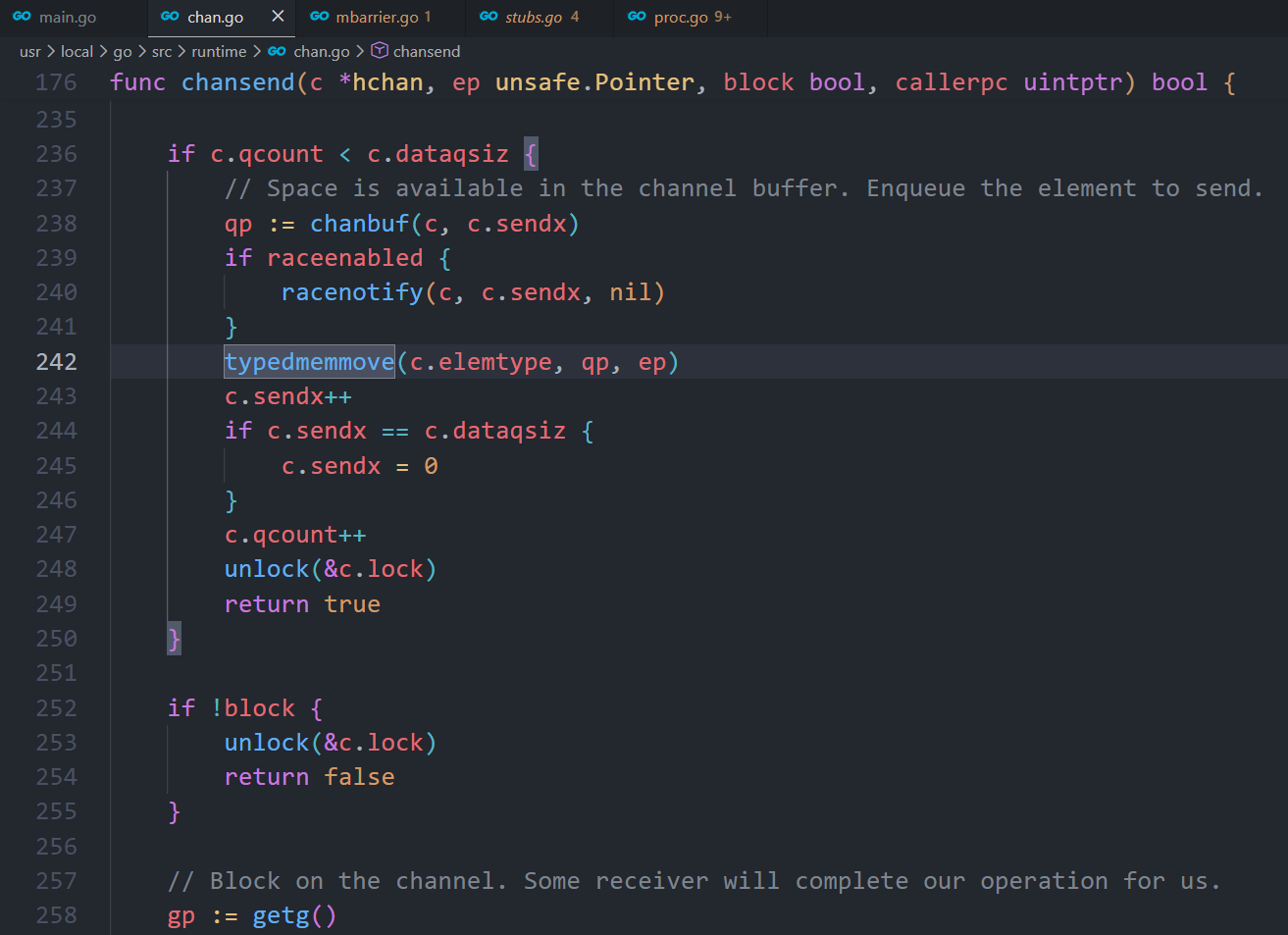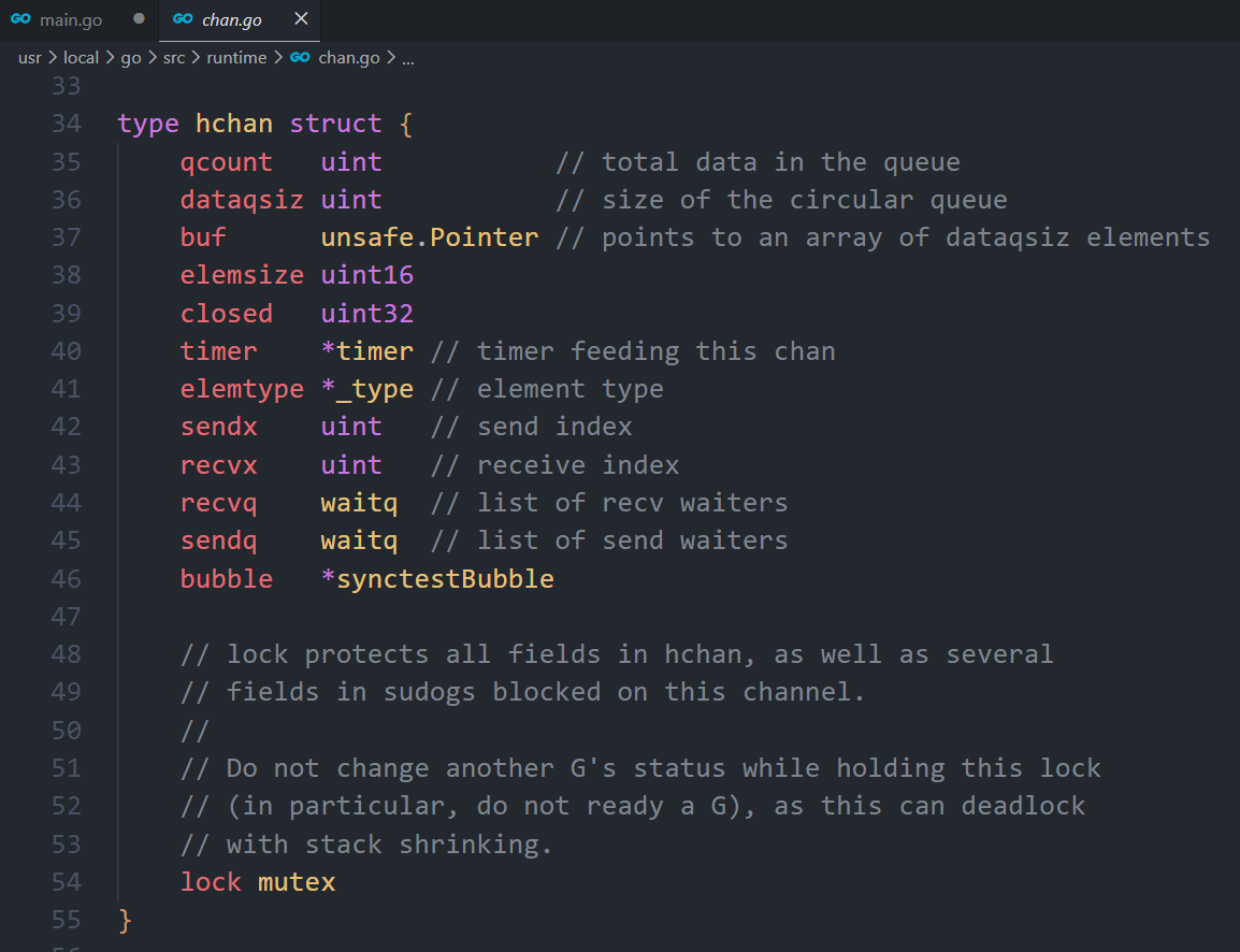channel的功能比较复杂,所以就不会是几个字节就能实现的,所以需要一个复杂的struct来承接channel的作用,也就是下文的hchan结构体
