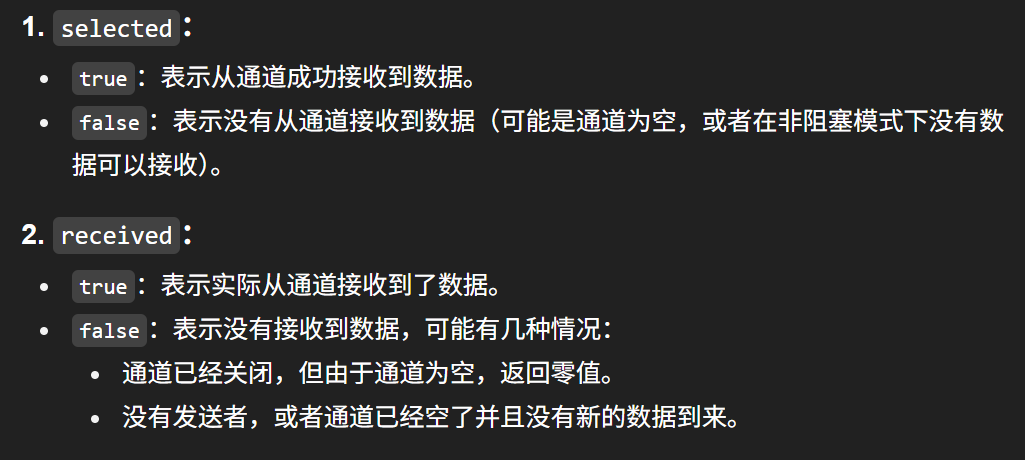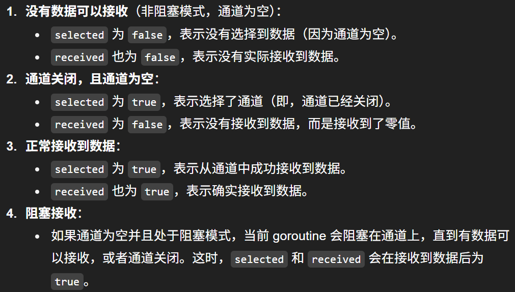 select的核心原理是,按照随机的顺序执行case,直到某个case完成操作 ,如果所有case的都没有完成操作,则看有没有default分支,如果有default分支,则直接走default,防止阻塞