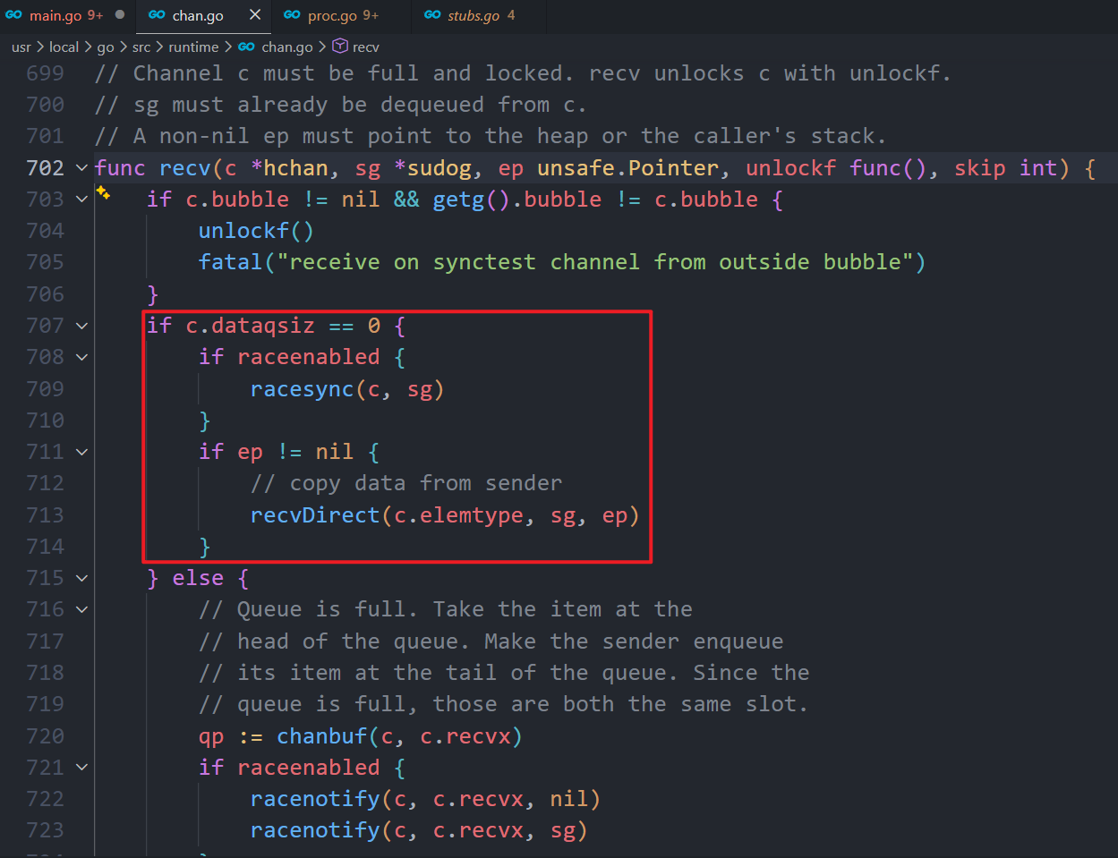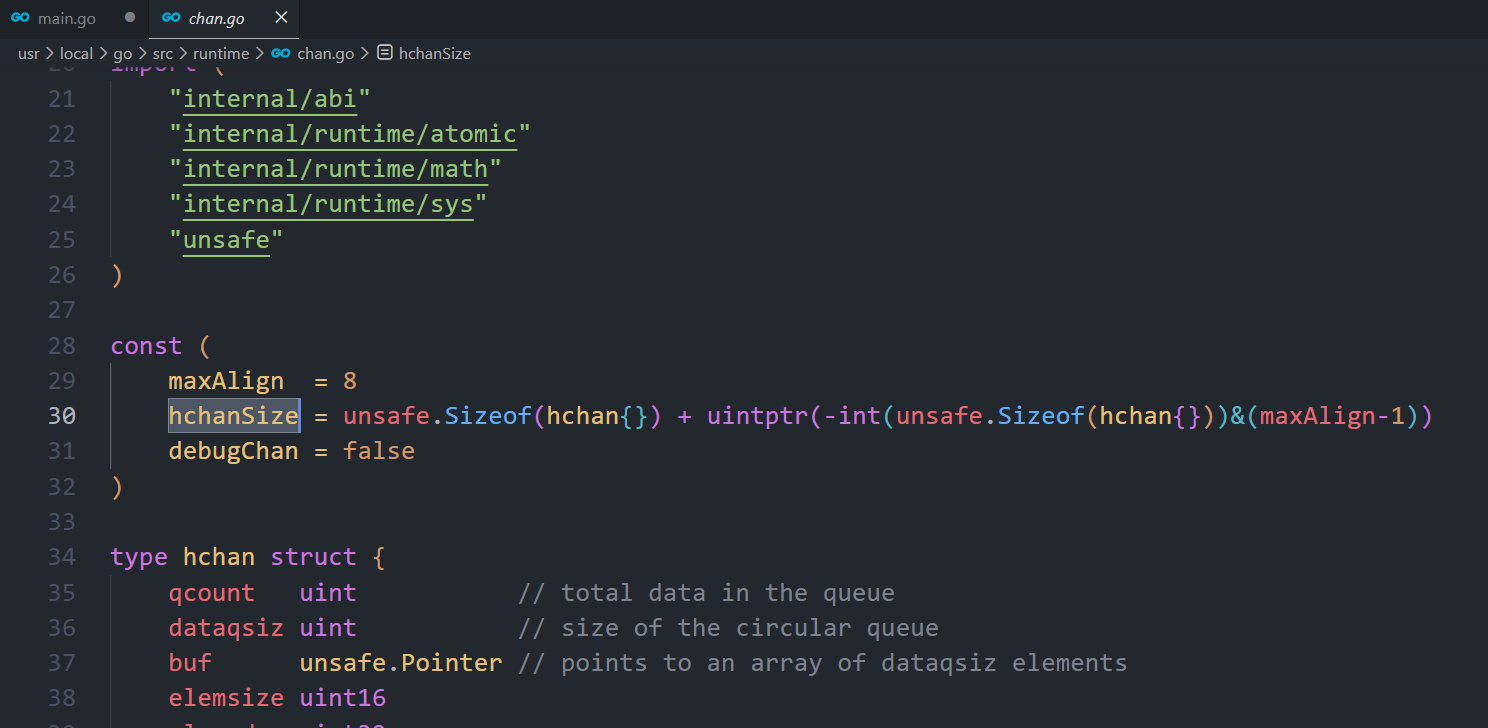 runtime.hchan的类型定义在源码 src/runtime/chan.go中: