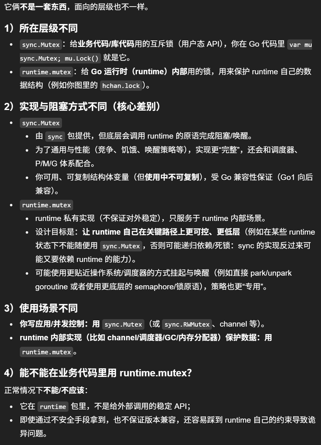 因为channel设计是用在多个goroutine之间的通信上的,所以需要一把mutex来保护读、写、关闭操作的并发安全【在并发/编程语境里,"同步/异步"最核心的区别就是 :发起一个操作后,要不要等它完成。】