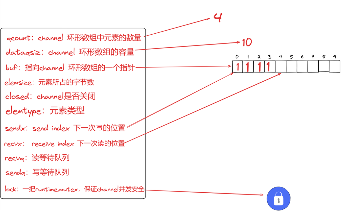对于channel,我们可以将数据缓存到其中,所以有一个buf数组,用来缓冲数据,又因为channel可以同时提供读写功能,所以我们有sendx 和 recvx分别指向下一次写和下一次读的位置,buf、sendx、recvx 就构成了一个环形数组,每次读或写超过最后一个下标,就会回到下标0处。