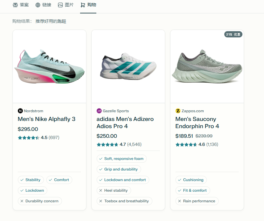 OpenAI之前,早就有AI开始投放广告了,如perplexity直接加入了购物功能: