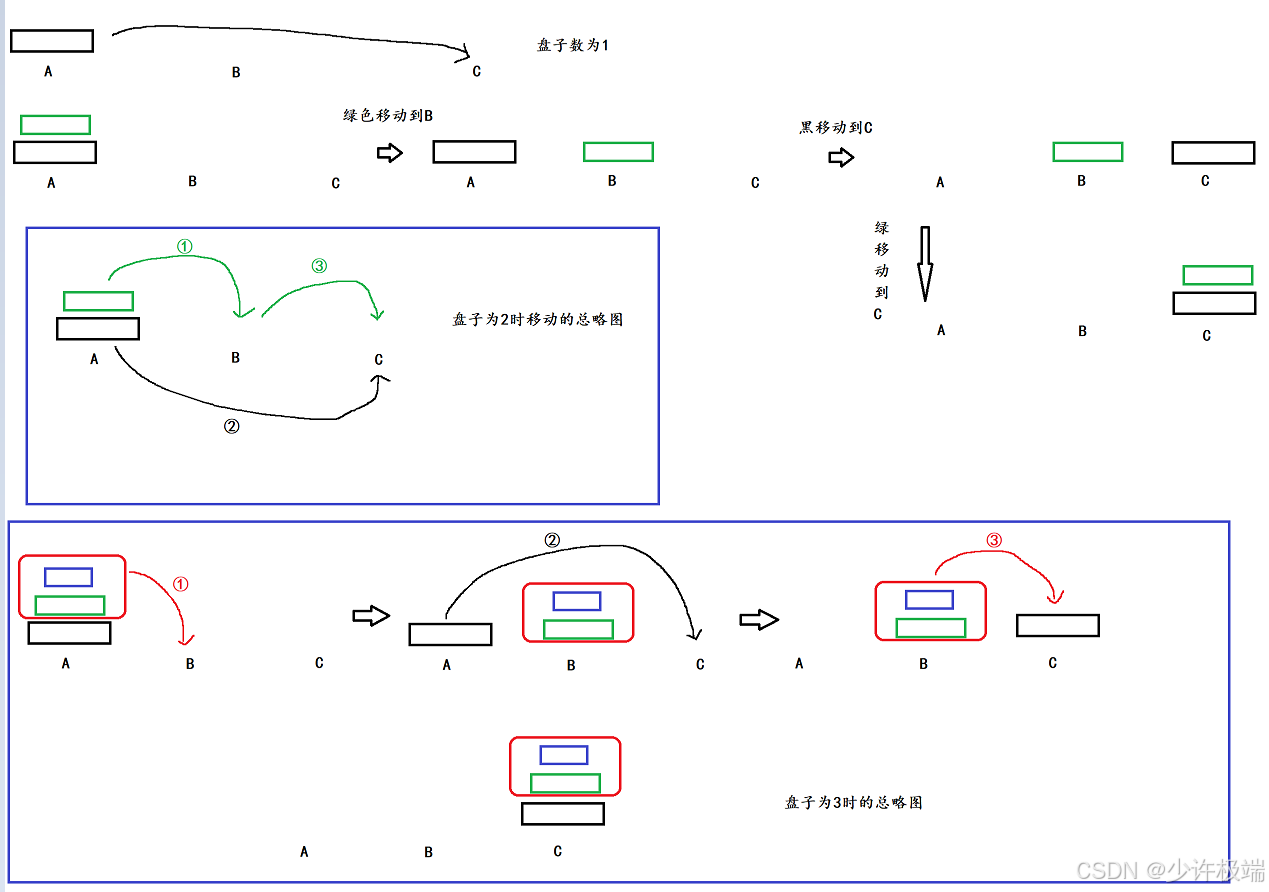 递归结束点(起始点): 2到n个盘子时, 都分为三个步骤, 但是1个盘子时, 就一步直接从起始柱移动到目标柱