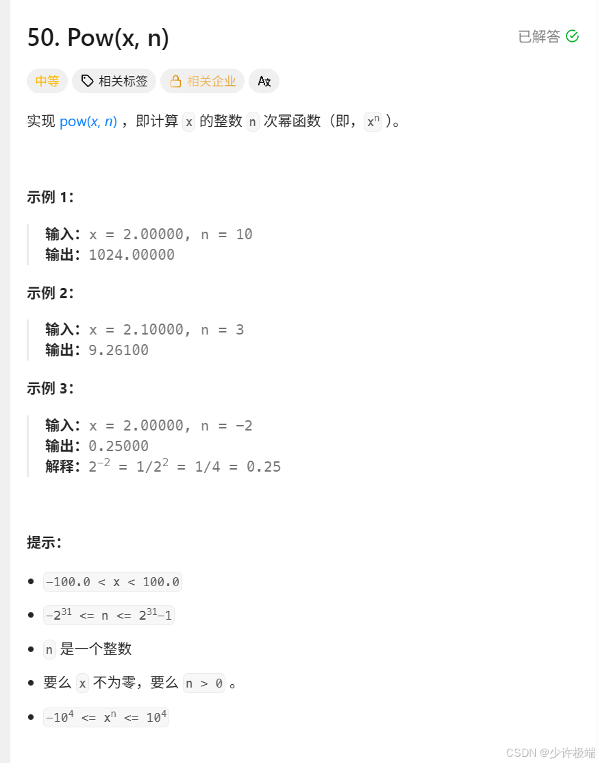 - [五. 力扣 [50. Pow(x, n)](https://leetcode.cn/problems/powx-n/description/)](#五. 力扣 50. Pow(x, n))
