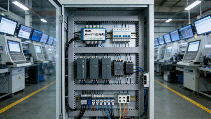 在每台机床的电气柜内采用 35mm DIN 导轨标准安装工业智能网关,无需额外改造柜体结构,安装便捷高效。网关接入 24VDC(±10%)稳定供电,完全匹配机床原有供电系统,最大功率仅 3.5W,不会增加电路负载。通过 CANopen 接线端子逐一连接 3 台伺服控制器、1 台主轴控制器及 8 个各类传感器,确保设备信号稳定传输;网关以太网口直接接入工厂局域网,与监控上位机及 MES 系统服务器建立物理连接,网络延迟低且传输稳定。