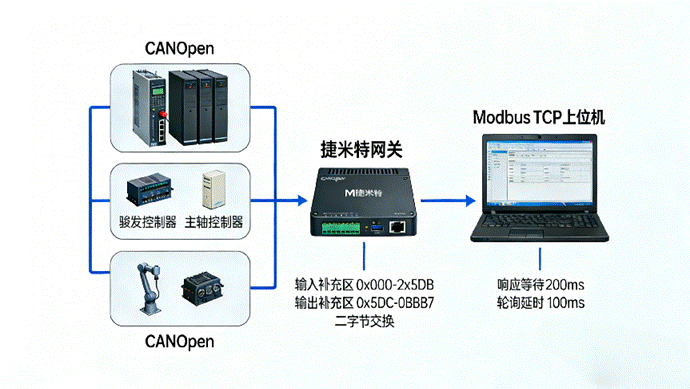 某机械加工企业专注于高精度零部件生产,车间部署了 12 台智能加工机床,核心控制单元均采用 CANopen 协议 的伺服控制器、主轴控制器 ,同时配备了温度、压力、振动等 8 类传感器,用于实时采集机床运行过程中的关键数据。然而,工厂的生产监控上位机 及 MES 系统 基于 Modbus TCP 协议搭建,由于 CANopen 与 Modbus TCP 协议不兼容,导致各机床的运行数据(如伺服电机转速、主轴切削力、加工区域温度、液压系统压力等)无法实时上传至监控平台。