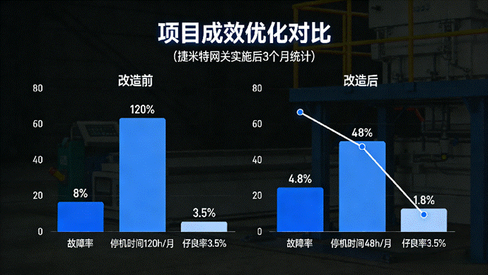 故障快速响应,生产稳定性提升:网关支持 10 个 Client 同时连接,生产管理、技术、运维等部门可通过多终端并行监控,结合状态字与异常码功能,故障响应时间从 1 小时缩短至 5 分钟,设备故障率从原来的 8% 下降至 4.8%,生产线停机时间减少 60%,每月减少经济损失约 20 万元。