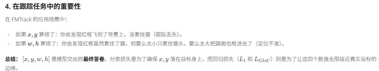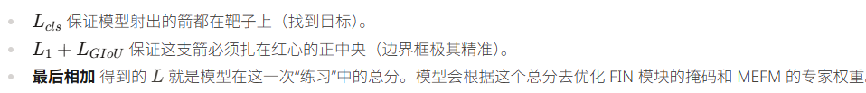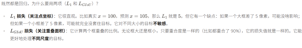 为什么要加在一起? 如果只用分类损失(L_{cls}),模型可能会告诉你"目标就在这一块区域",但它不在乎框画得圆不圆、正不正。 如果只用回归损失(L_1, L_{GIoU}),模型可能会把背景里的石头框得非常精美,因为它根本没去学怎么区分目标和背景。