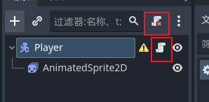 - 在玩家的根节点那里我们会发现右边有一个卷轴图标,表示这个玩家节点目前正在挂载着一串代码,如果我们不想他进行挂载的话,我们可以点击上面的卷轴叉图标
