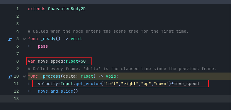 - 接下来我们需要在编辑器上实时的检测玩家在wsad键盘上的输入转化为游戏里面玩家角色的移动这样子就可以根据玩家的操作进行移动了,但是默认的是每次只有移动一个像素,所以我们还需要加一个速度值的变量(方便进行修改,变化)