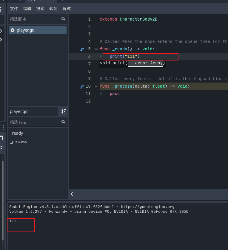 - 让我们把原本的pass删掉,然后写一个打印,然后点开始运行游戏,这样子在下方的终端就会显示打印的信息