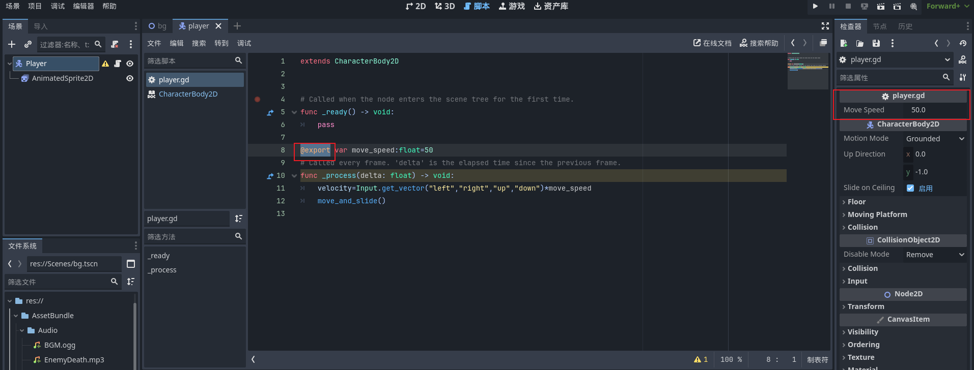 - 另外为了方便调整变量的数值而不是在代码里面进行修改,我们可以在变量面前加一个@export,这样子就可以在右边的监视器上进行快捷的调整数值,这里注意就是这里的修改不会同步到代码里面中,而是优先级更高,自动覆盖掉代码里面的设置的数值
