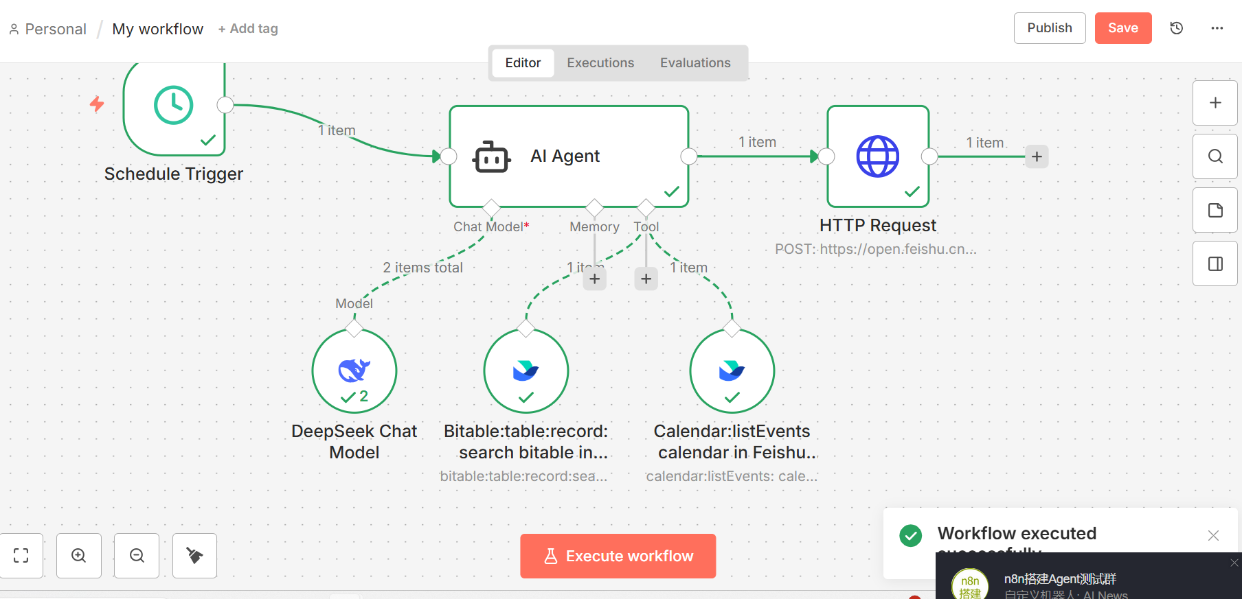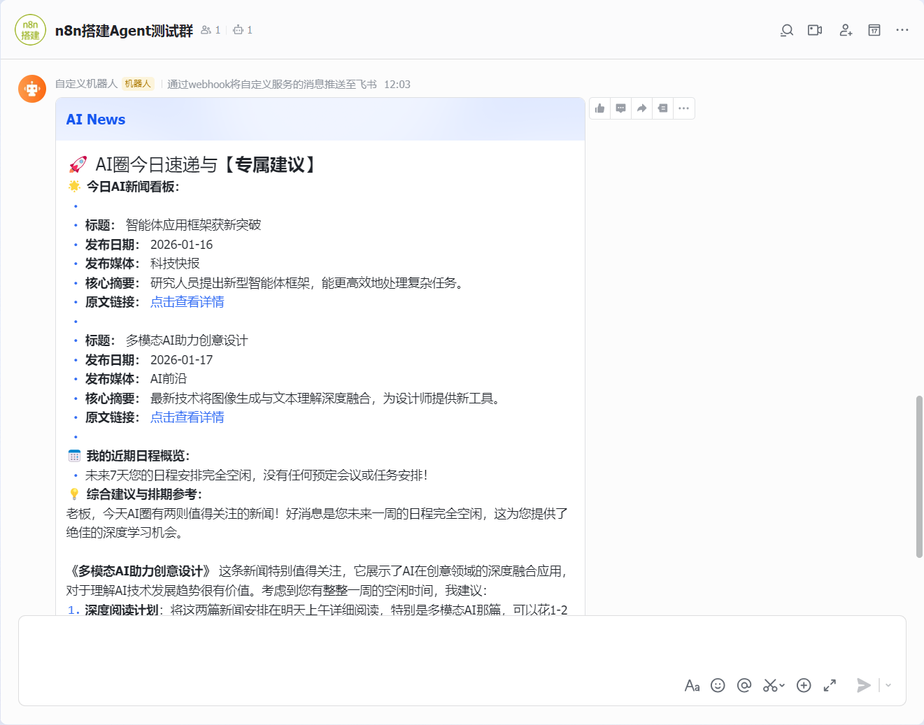 此篇文章搭建的Agent的核心功能包括:每日早晨整合AI领域最新资讯,结合用户个人日程安排,自动推送定制化的新闻早报与日程规划建议。