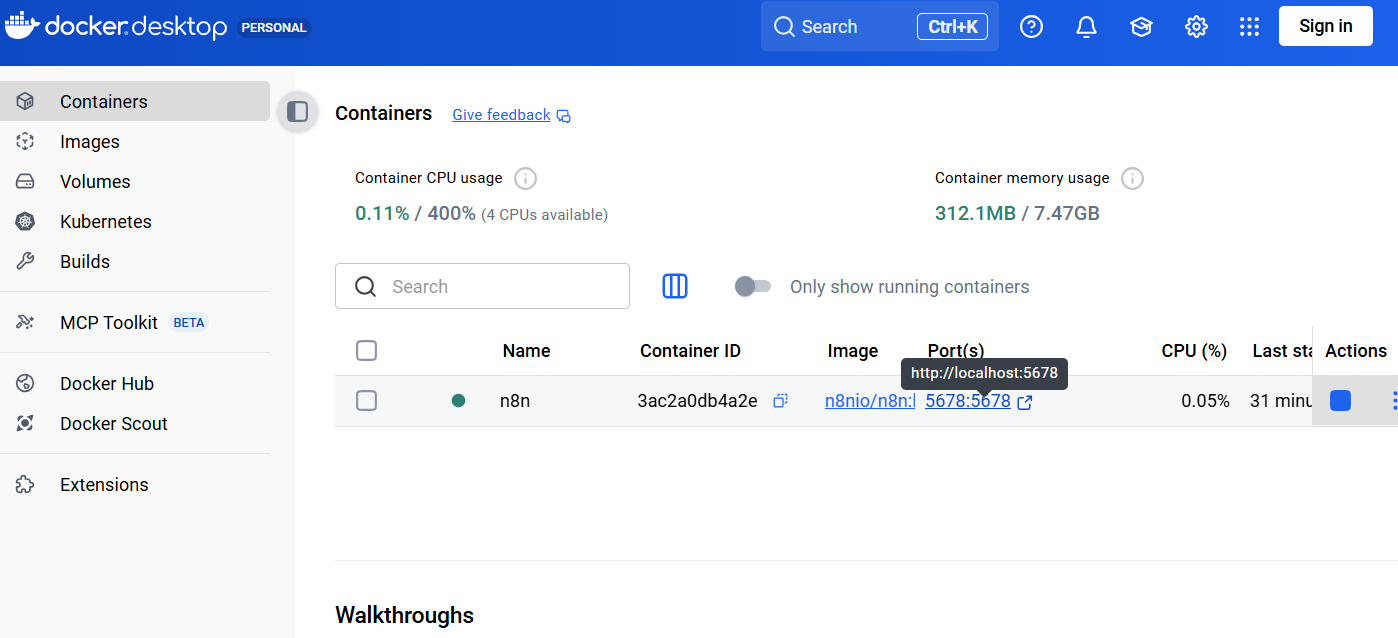 再打开Docker Desktop可以看到启动的容器,浏览器打开:http://localhost:5678