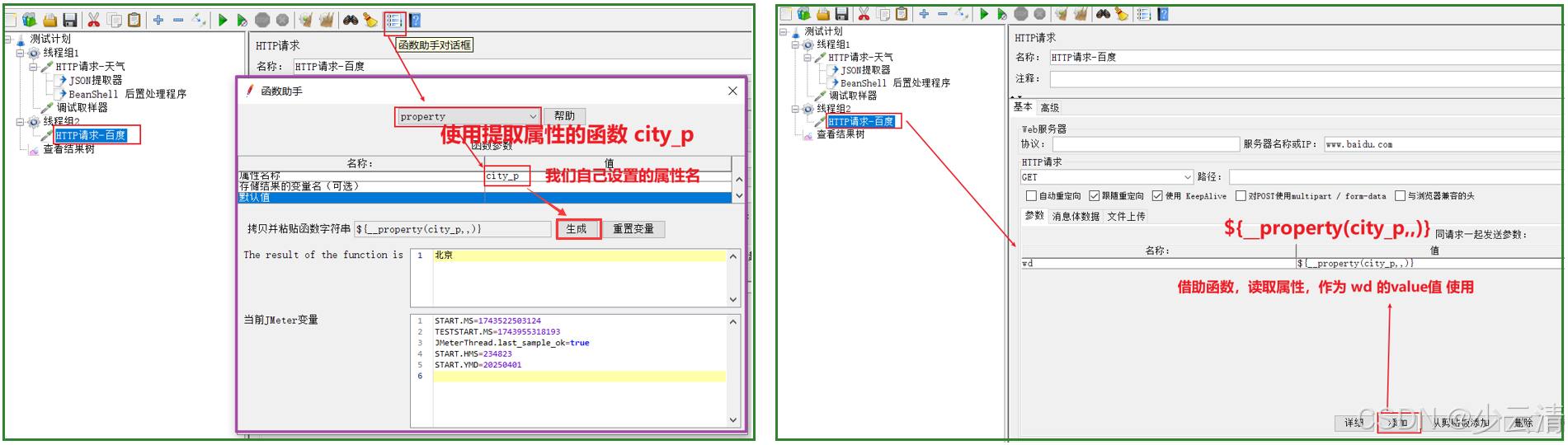 当有依赖关系的两个请求(一个请求的入参是另一个请求返回的数据) , 放入到不同的线程组中时, 就不能使用提取器保存的变量来传递参数值, 而是要使用Jmeter属性来传递。