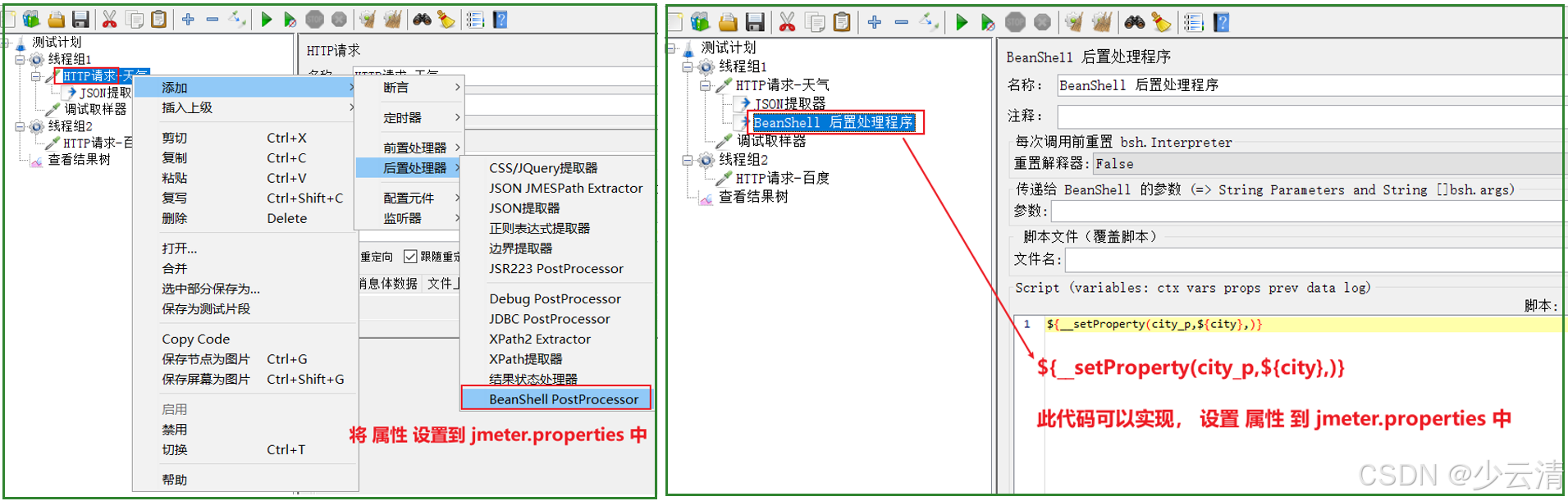 备注: setProperty函数需要通过BeanShell取样器来执行(BeanShell取样器作用:执行函数和java脚本)