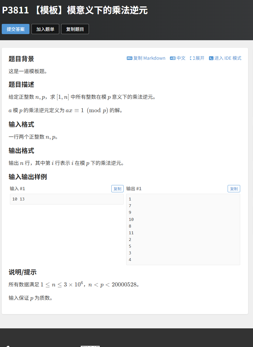 四、实战例题 1:洛谷 P3811 【模板】模意义下的乘法逆元