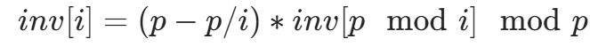 inv[i] = (p - p / i) * inv[p % i] % p;