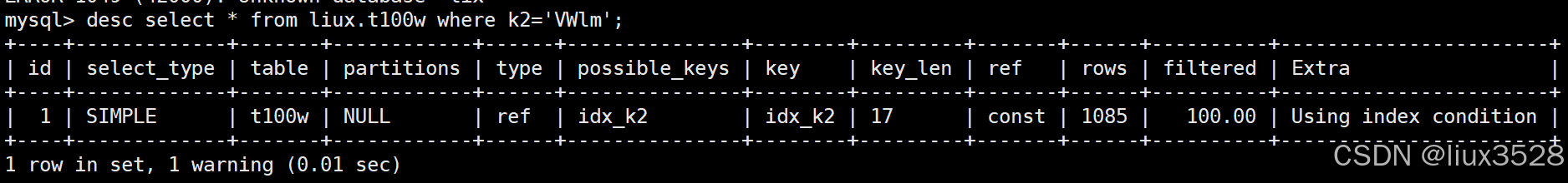 mysql> desc select * from liux.t100w where k2='VWlm';