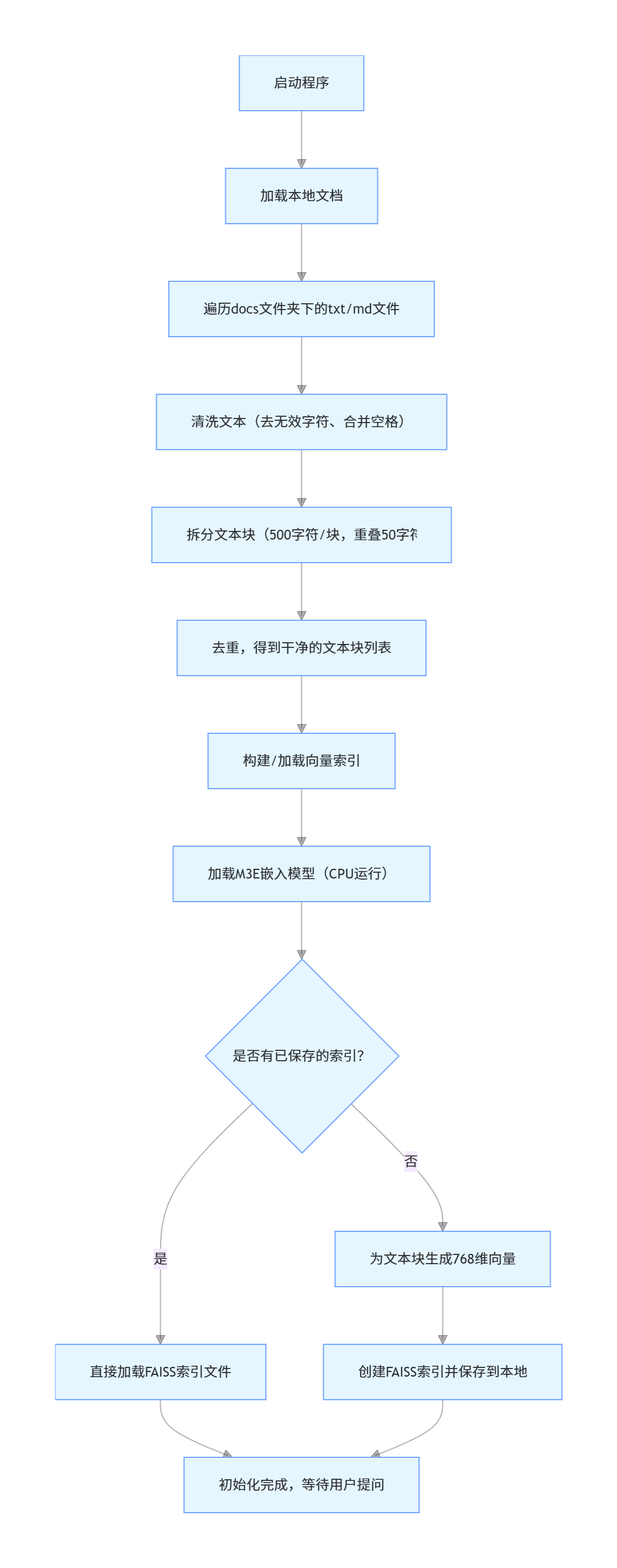 | 向量构建 | 把文本块转成机器能理解的向量,用 FAISS 存储(首次构建,后续复用) | M3E 嵌入模型、FAISS 向量库 |