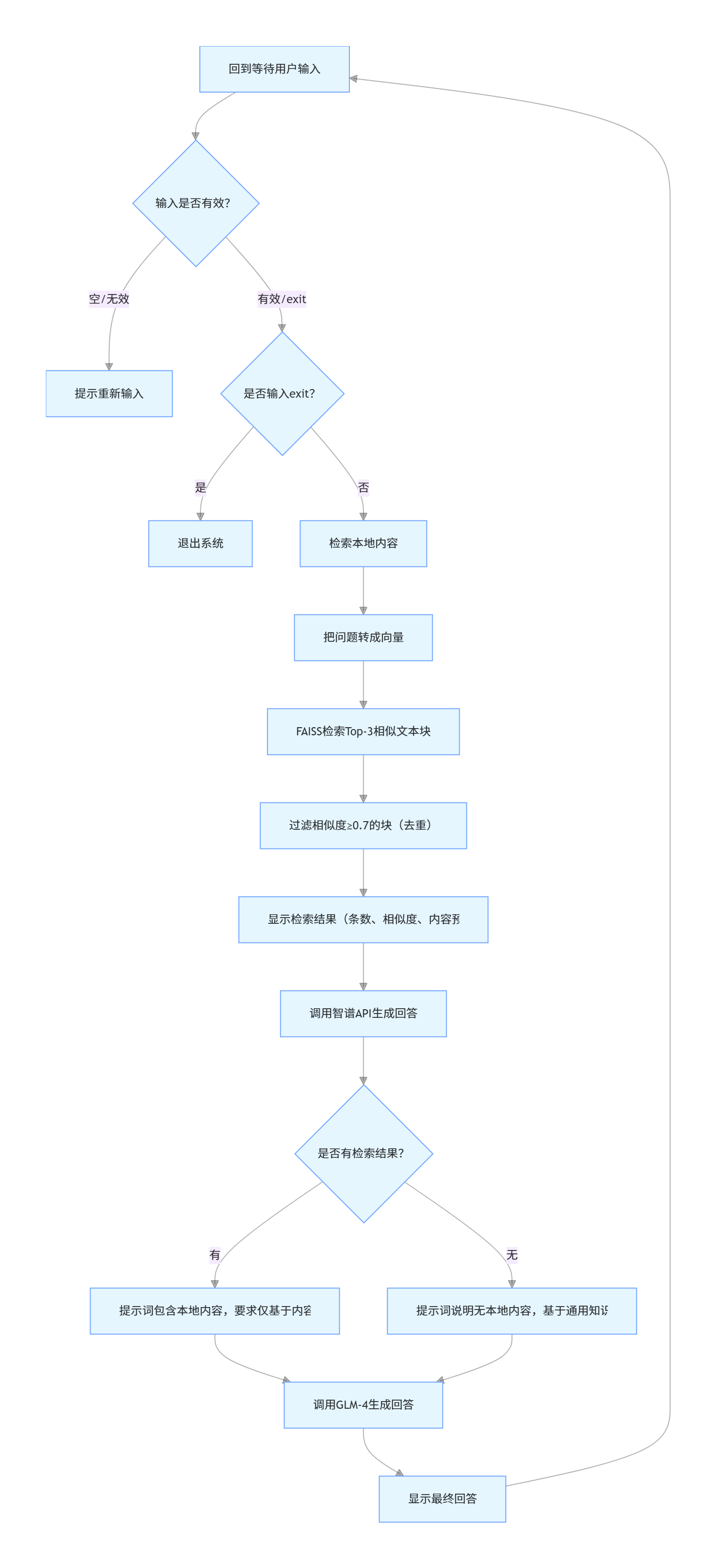 | 交互逻辑 | 提供命令行交互入口,支持持续问答、退出等操作 | 循环输入、结果可视化 |