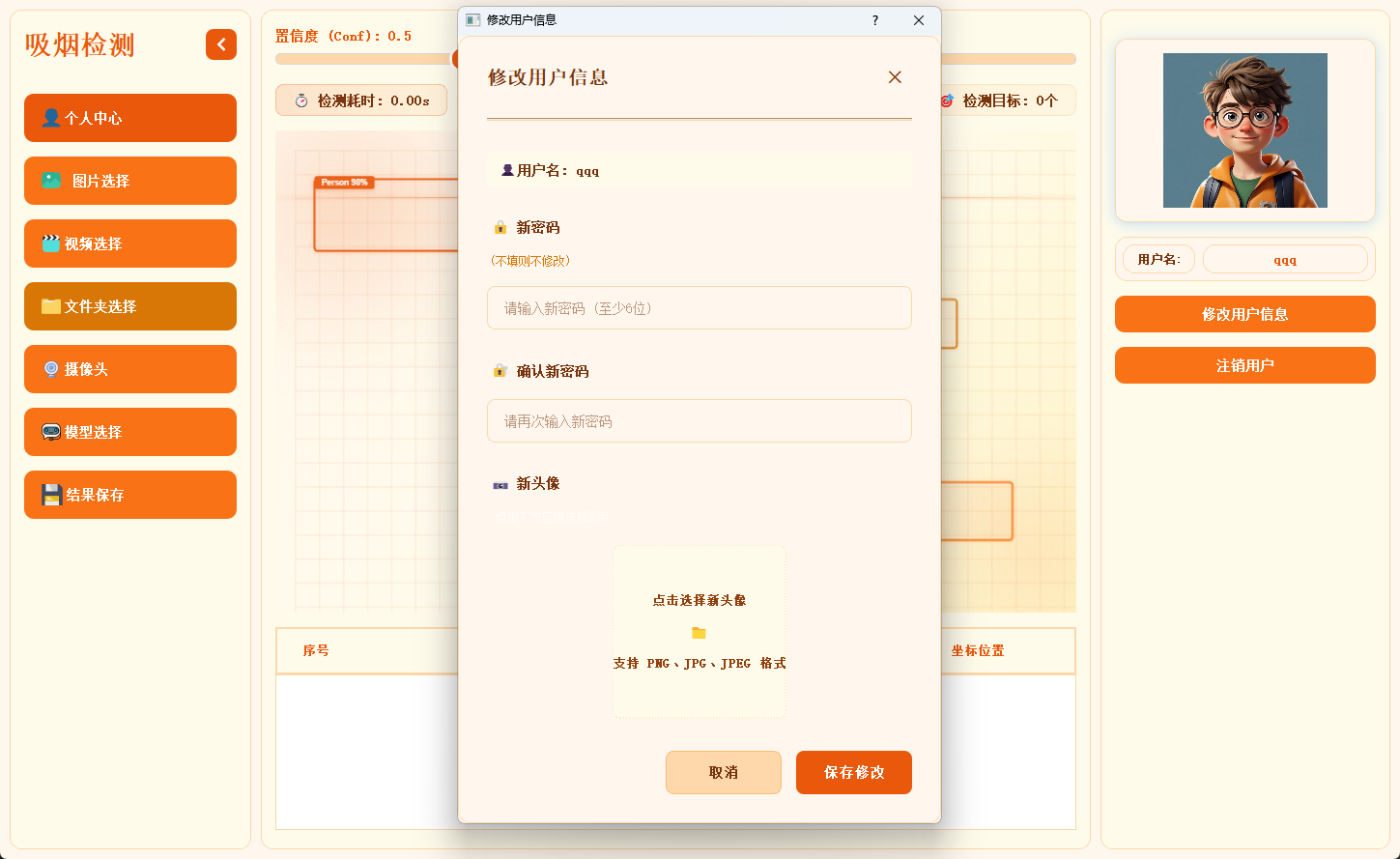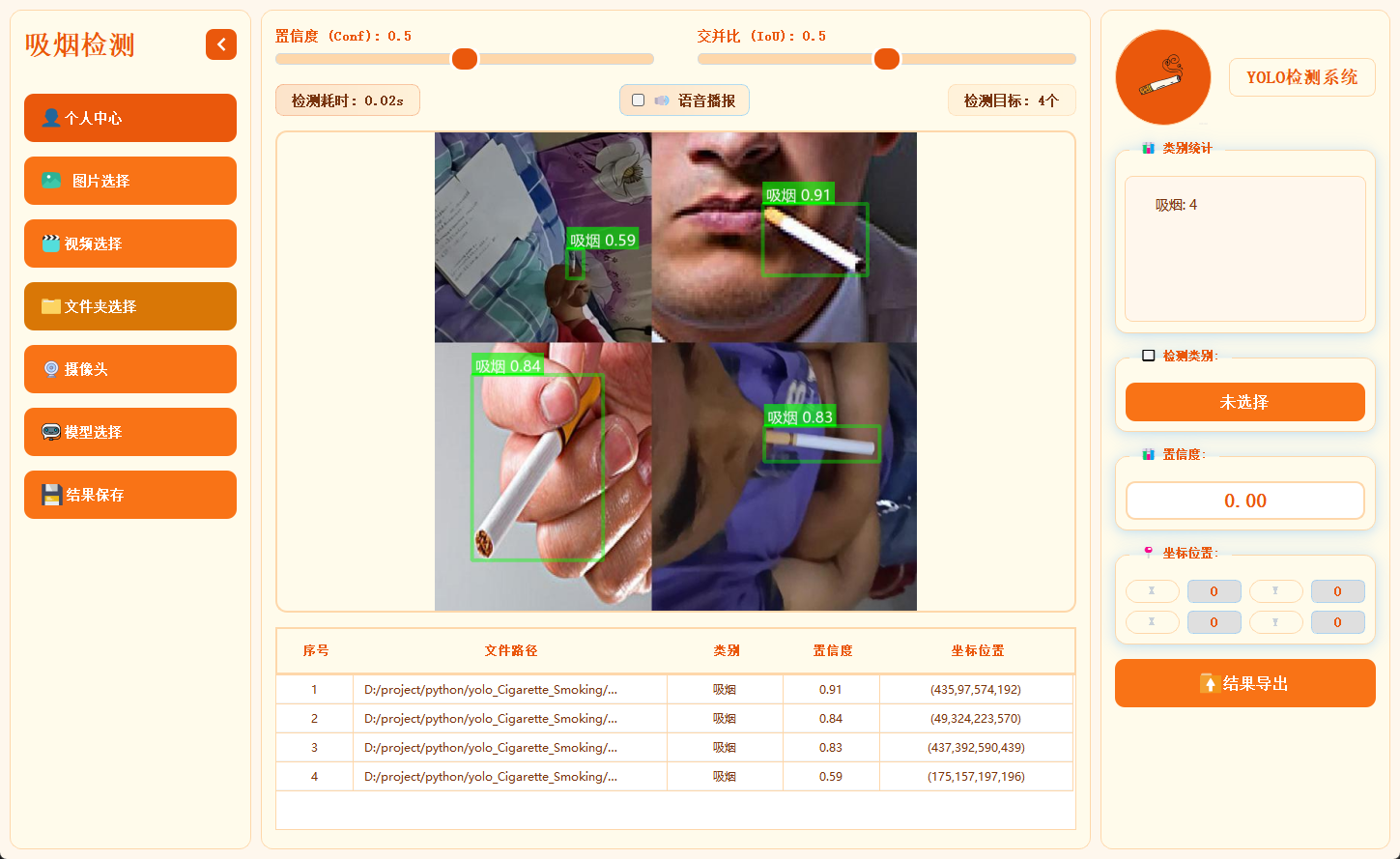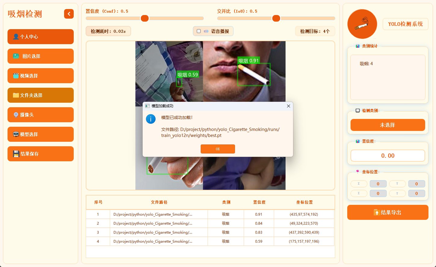 正是在这样的背景下,我们这套基于YOLO算法的吸烟检测系统应运而生。它以YOLO系列算法的高效目标检测能力为核心,突破传统局限:支持图片、视频、文件夹批量图片、实时摄像头流等多源输入 ,不仅能快速识别画面中是否存在吸烟行为,更能通过模型优化实现对吸烟动作的精准捕捉;系统界面采用模块化三区域设计------左侧集成模型加载(支持runs目录下多模型切换)、数据源选择与结果保存(生成带标注的可视化文件),中间区域提供置信度/交并比动态调节、检测耗时与目标统计实时反馈,辅以语音播报(预制警报音频可自定义替换)增强警示效果,右侧则通过类别统计、详情表格与点击联动展示,让检测数据一目了然。更值得关注的是,系统内置登录权限管理 (支持注册、个人信息修改与注销)、脚本化检测 (无需界面即可批量处理图片/视频/摄像头流)及模型训练脚本(基于6728张训练集+842张验证集,支持四模型并行训练与权重导出),真正实现"检测-分析-管理-迭代"全流程闭环。