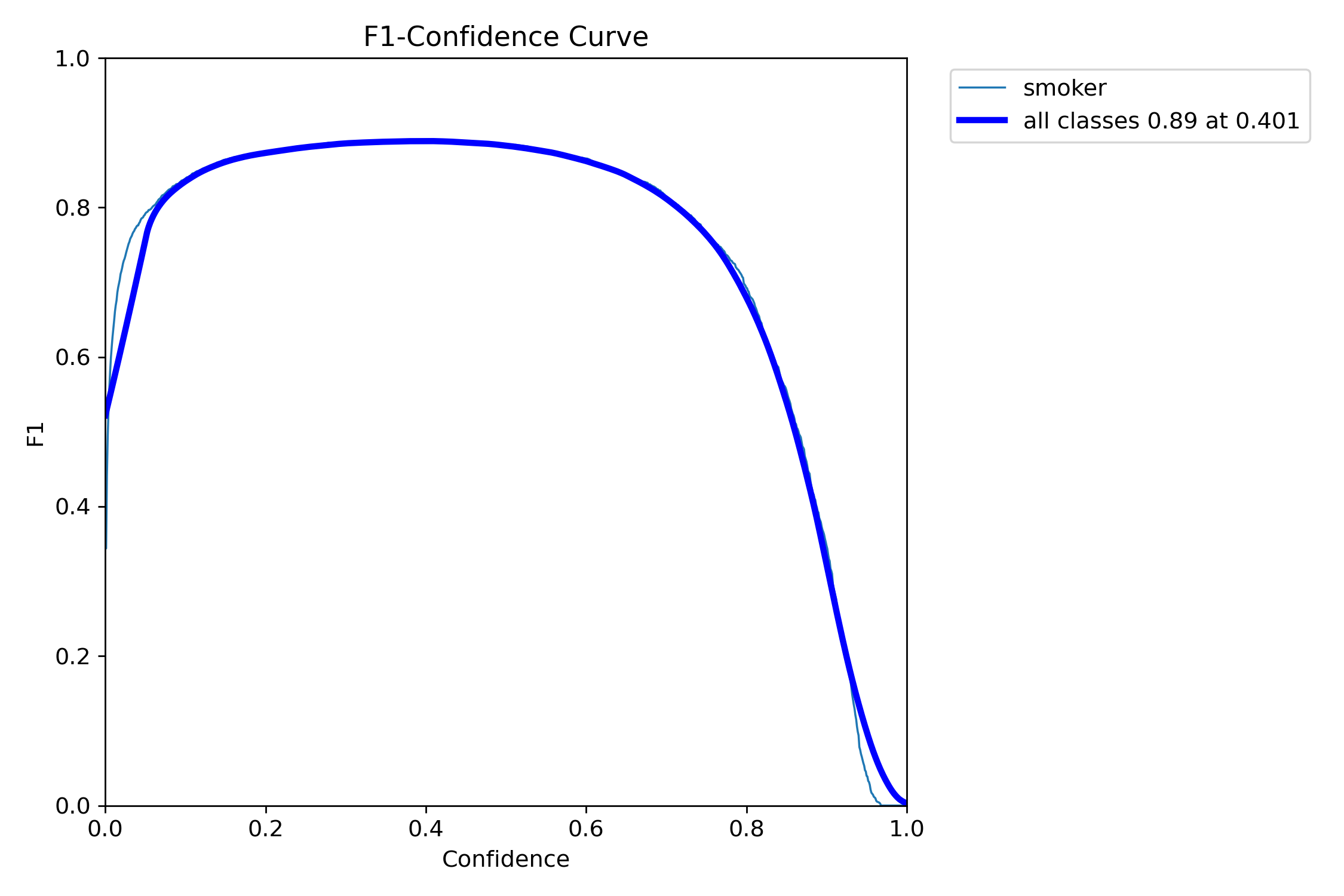 当置信度为0.401时,所有类别的综合F1值达到了0.89(蓝色曲线)。