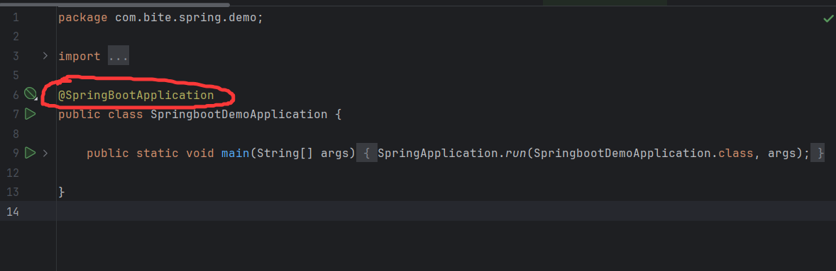 在这个类中有一个@SpringBootApplication注解,这个注解是将这个类标识成启动类的主要原因。一个项目只能有一个启动类。