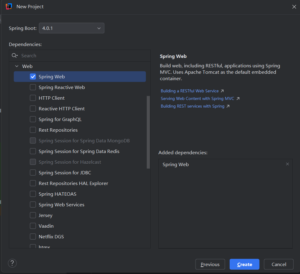 在依赖这里我们可以选择Spring Web,这是我们写网络接口的基础。我们选择了这个依赖,相当于springboot代替我们使用maven配置了一个个的依赖。