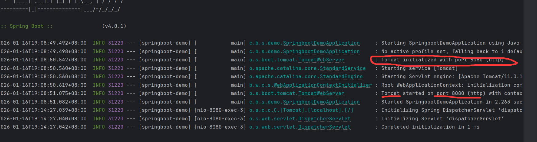 写完这个类后,要在启动类那里重新启动一下项目!(每一次修改代码后,只有重新启动了项目,被修改的代码才会生效!)