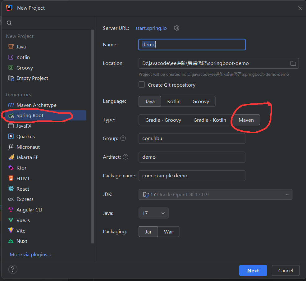 新建项目时需要使用SpringBoot的插件,专业版内置了这个插件无需下载。如果使用的是社区版可以去下载一个叫做Spring Initializr的插件。还有就是类型选择Maven。剩下的团队名称和项目名称可以自己取一个。