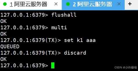当前事务队列中的所有待执行的命令被丢弃, 不再执行