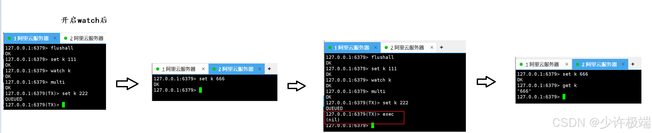 监视当前在开始事务multi和执行事务期间exec, 事务中的数据有没有被其他客户端二次修改过, 如果被修改了, 不再进行事务中对该key的修改操作