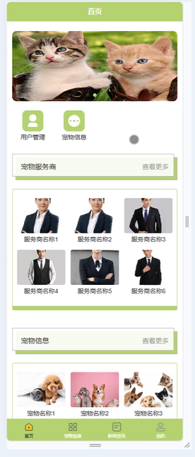 拥有系统全权限管理能力,包括轮播图展示管理、新闻资讯发布与编辑、用户反馈建议处理;宠物信息审核与发布、用户及宠物服务商账号增删改查;宠物服务预约情况查看与统筹,同时负责系统数据维护与安全管控,确保系统有序运行。