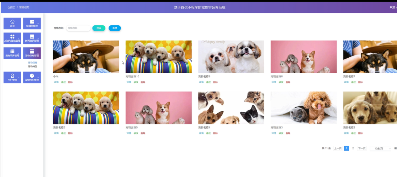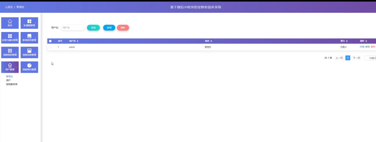 多角色协同管理体系:突破单一用户视角,构建管理员、用户、宠物服务商三方联动机制,明确各角色职责边界,实现宠物寄领养全流程闭环管理,提升行业服务规范化水平。