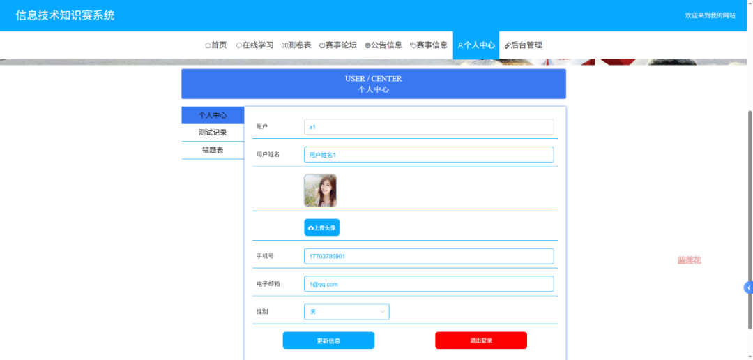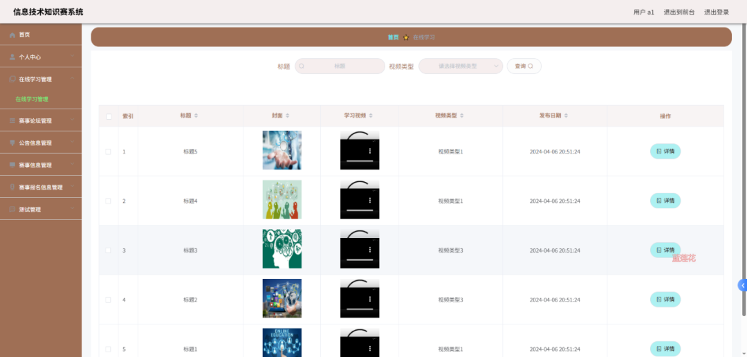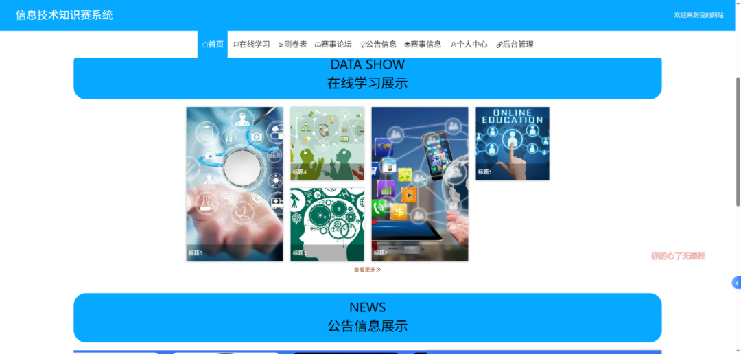 信息技术知识竞赛系统围绕参赛者与管理员两大角色,搭建网站前台与网站后台两大功能板块。网站前台面向参赛者,支持其完成用户注册与登录,便捷查看赛事公告及赛事流程信息;参赛者可通过专属报名链接提交个人申请资料完成赛事报名,还能利用在线学习模块观看学习视频,借助在线测验提前测试并获取自动计算的分数,同时可在赛事论坛参与知识赛相关话题讨论。网站后台服务于管理员,可实现对注册参赛者信息的管理,能发布赛事公告与赛事报名信息,查看并审核参赛者提交的报名资料,还能发布在线学习模块的视频信息、在线测验的考题题库信息,且具备赛事论坛管理功能。