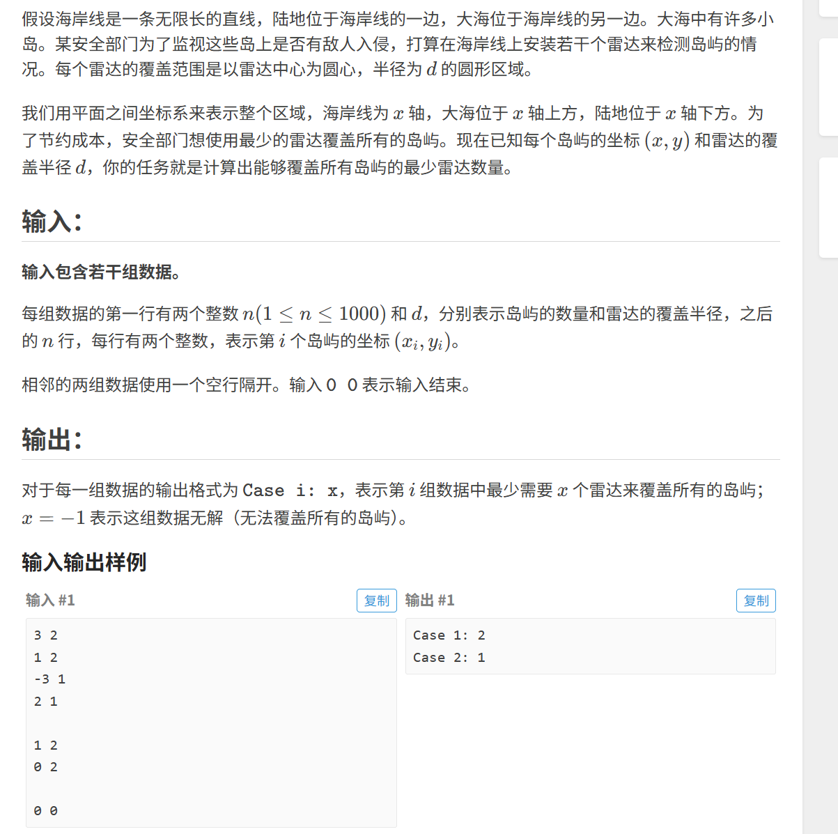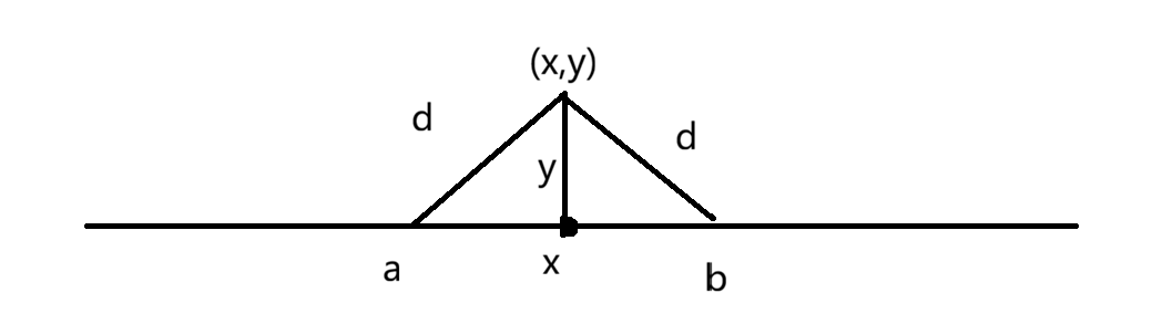 由图可知,当一个岛屿的坐标确定时,我们可以计算出,哪段区间可以使雷达覆盖这个岛屿