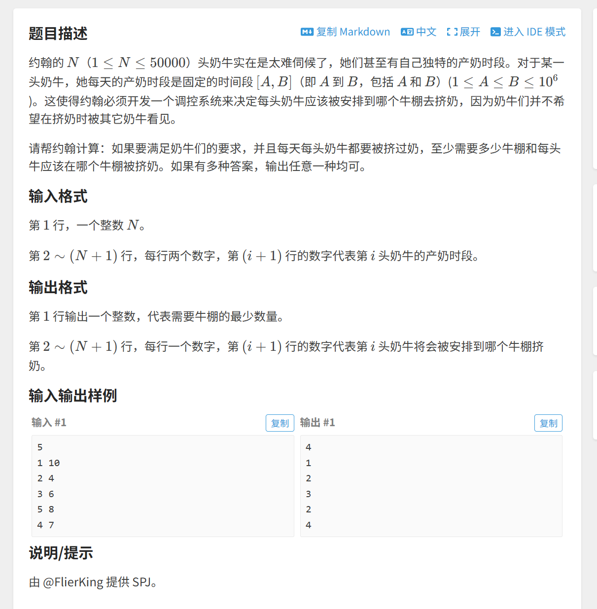 按照「起始时间」对所有奶牛「从小到大」排序,然后「从前往后」依次安排每一头奶牛,设这头奶牛的产奶的时间区间是[a,b]: